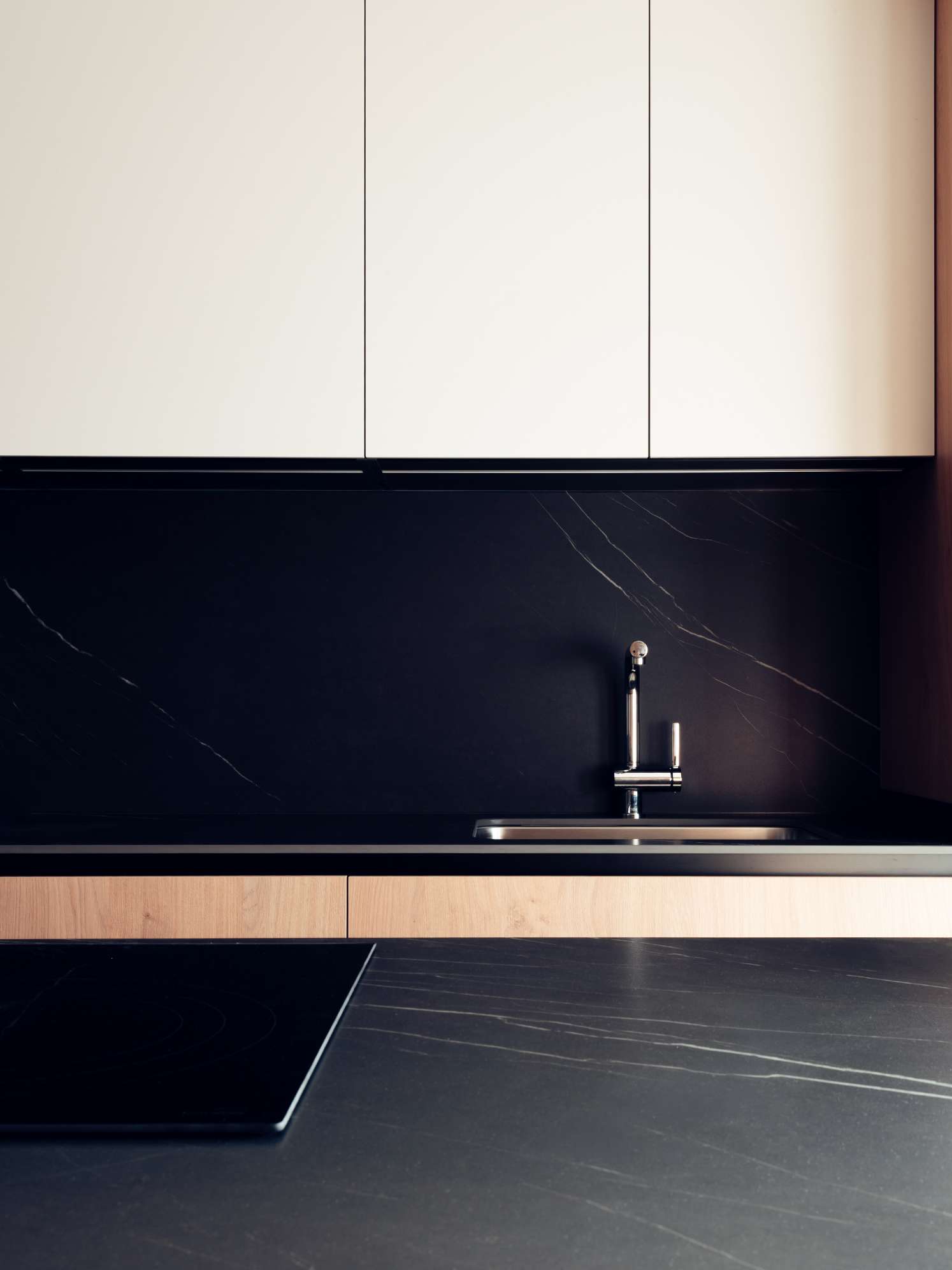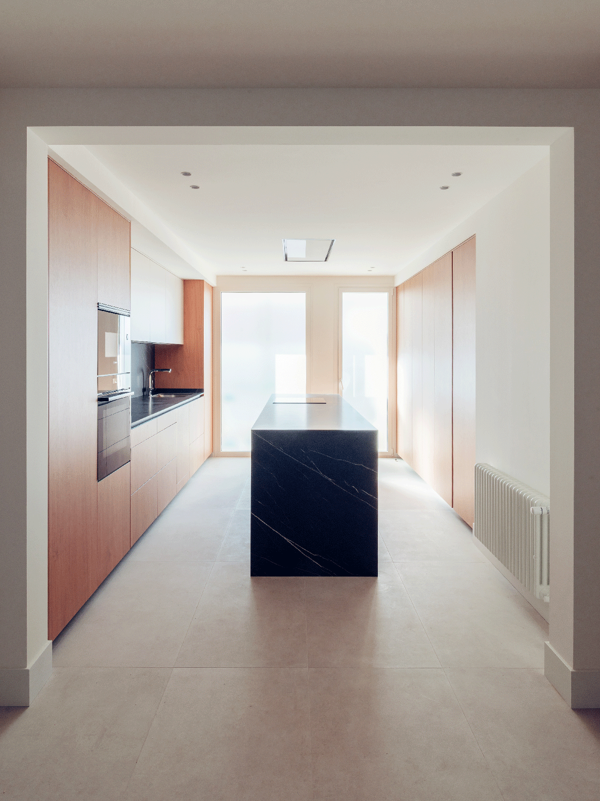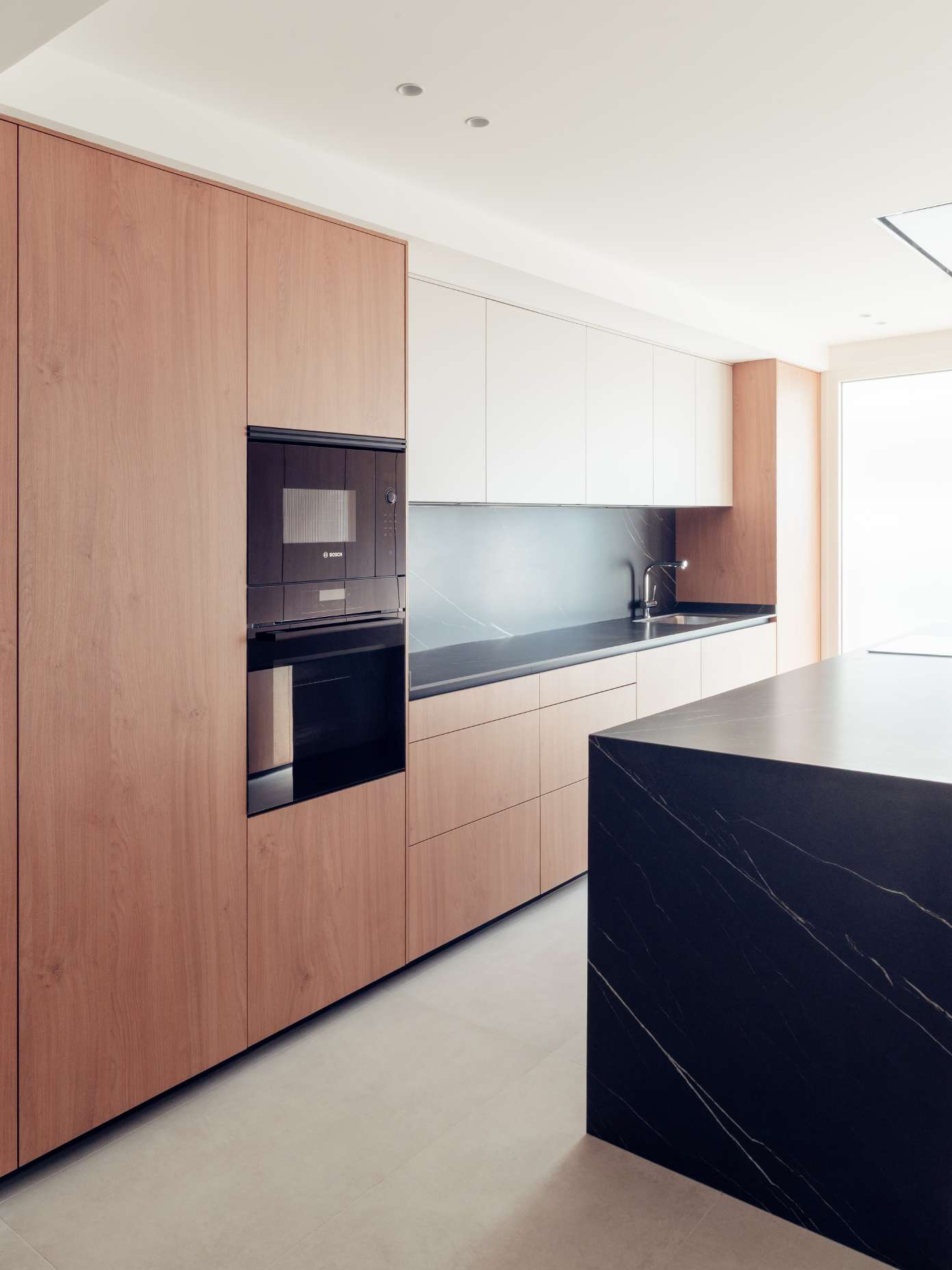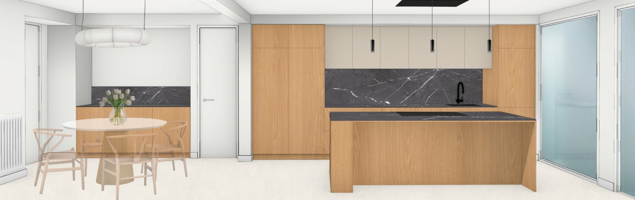 The aesthetic is inspired by Nordic design, where warmth and simplicity are combined with a carefully curated selection of materials. Wooden flooring takes center stage, providing continuity throughout the home. This design language is complemented by the use of sandy-toned porcelain tiles in the bathrooms and kitchens, which act as a counterpoint, adding texture and a natural feel. The materiality is further enhanced by warm finishes in the kitchen and bathroom furnishings, harmonizing the overall design and balancing the interior composition.