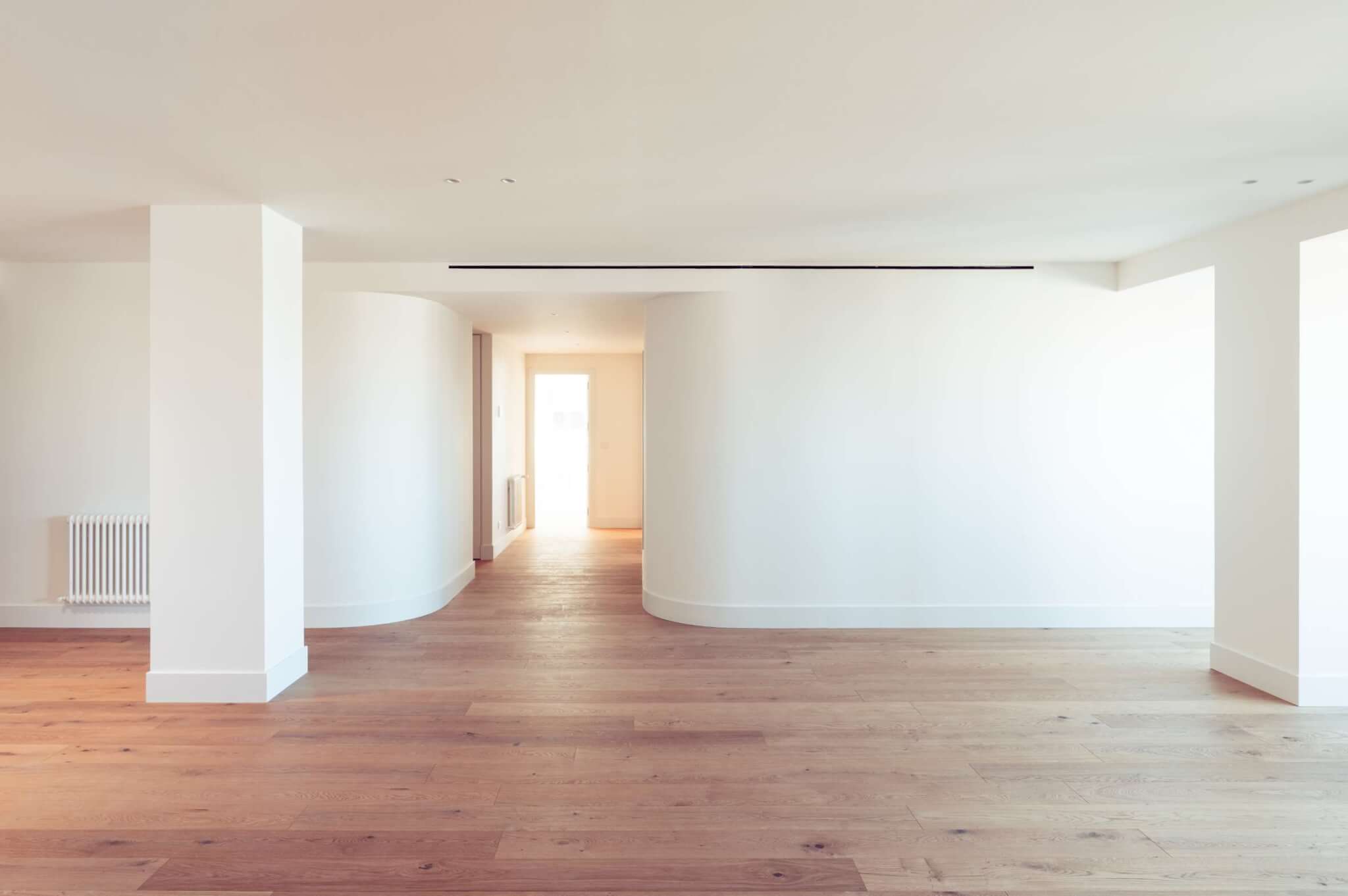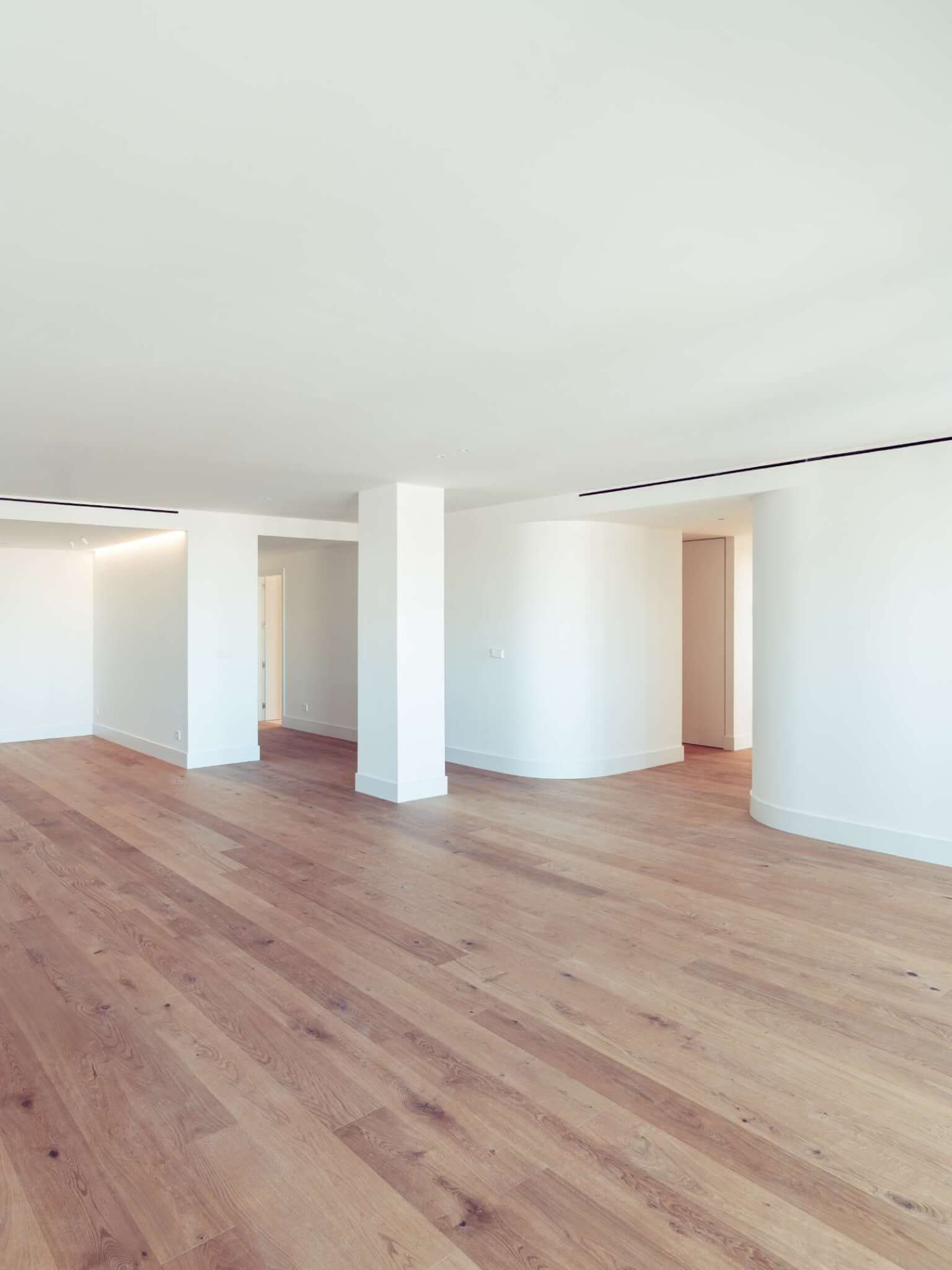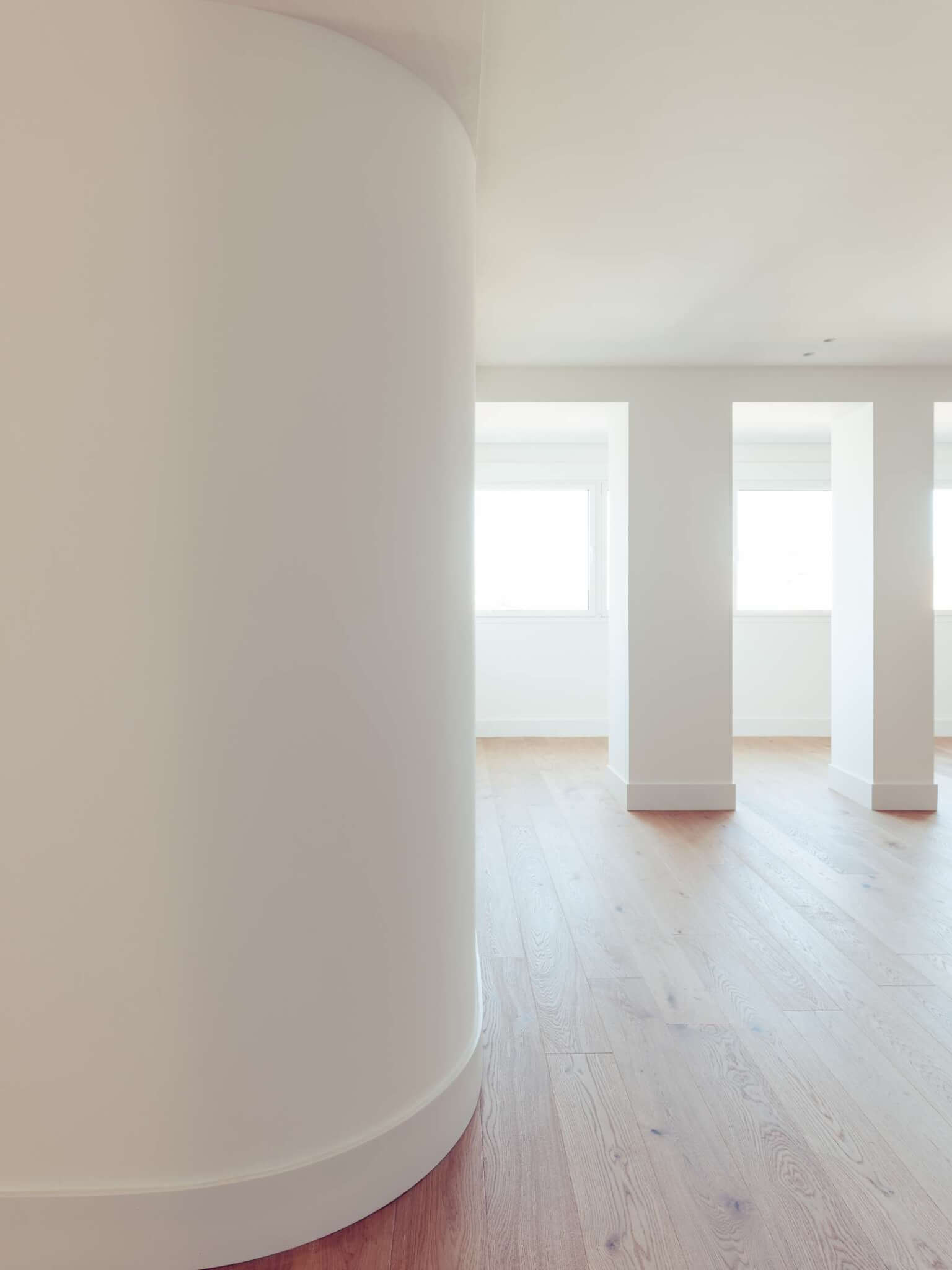 One of the project’s defining elements is the incorporation of curved partitions that define the transition between the living area and the bedrooms. These soft geometries bring movement, personality, and a contemporary character to the space.